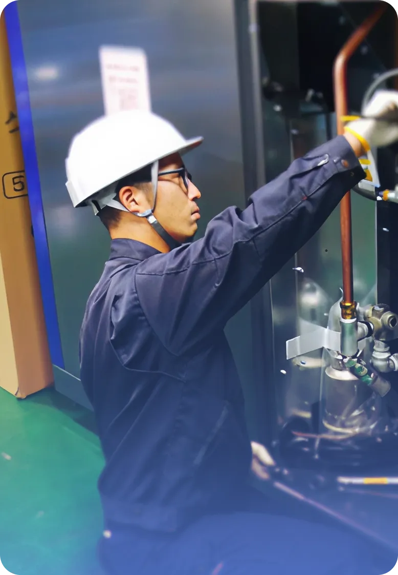 ■エアーコンプレッサーの販売、メンテナンス業務 エアーコンプレッサーは導入したあとも、年に一度の定期メンテナンスを通じて、10年以上にわたりお客様との関係が続いていきます。